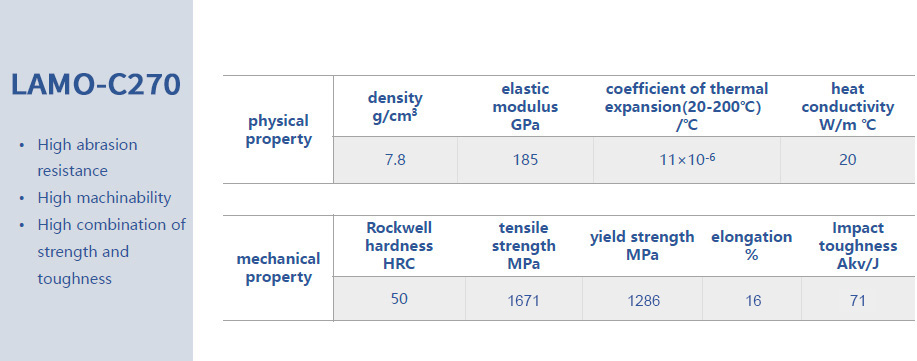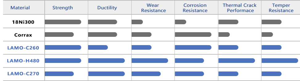 To improve print quality, LAMOTEK has independently developed several new materials to meet a wider range of product needs. Currently, three of the most commonly used proprietary materials developed by LAMOTEK are LAMO-H480, LAMO-C260, and LAMO-C270. Among them, LAMO-H480 exhibits good fatigue resistance, excellent wear resistance, and rust prevention properties, making it suitable for most injection and die casting molds. LAMO-C260 boasts high strength, high hardness, and good rust resistance, making it suitable for injection molds. LAMO-C270 offers excellent toughness, outstanding wear resistance, good rust prevention properties, and relatively superior machinability, making it a cost-effective comprehensive material.