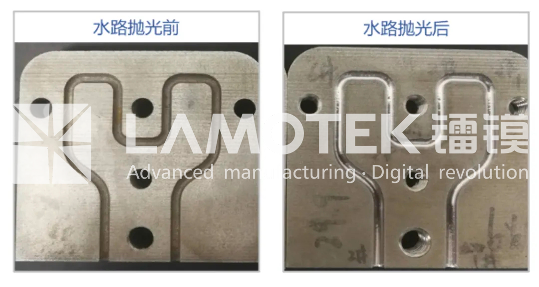 镭镆科技自主开发了一种水路抛光处理工艺LCP,极限抛光后表面粗糙度Ra<1μm,能够有效地降低水路堵塞与开裂风险,大大减缓锈蚀速度,显著改善并稳定水流速度。尤其是针对不防锈材料以及直径2mm以内的细小水路,对水路进行抛光处理显得尤为重要。